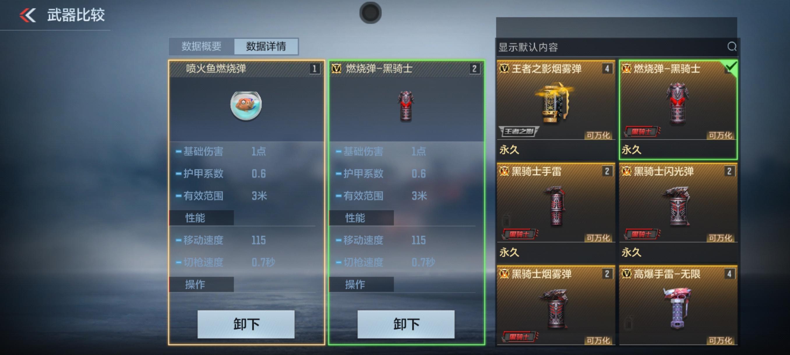 在数据方面,喷火鱼燃烧弹和英雄级的燃烧弹-黑骑士在基础伤害、范围、移速、切枪速度等方面完全一致。形成的火焰持续时间也是相同的。可以说两者在属性方面并无差异。