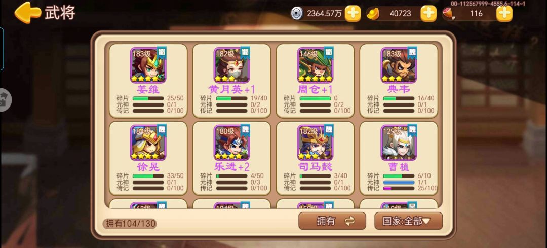 入坑两个月天天看攻略,有些攻略有问题,大概知道平民也就几个核心武将,法系输出曹植孔明庞统,得此三将横行天下,物理输出吕布典韦邓艾关妹,控制姜维徐晃乐进董卓妙才,肉盾张宝许褚刘禅,buff蔡文姬月英荀彧。以后要做的套装如下:孔明七星,曹植百川,庞统剑魂,吕布邓艾枪系七星,孙坚甘宁刀系七星,蔡文姬幽蝶,姜维月光,关妹邀月,徐盛用风套算了,七星套想要搞三套,不为别的几个人气武将不管副本有没有用,日常推周不要频繁换装备就行,慢慢来