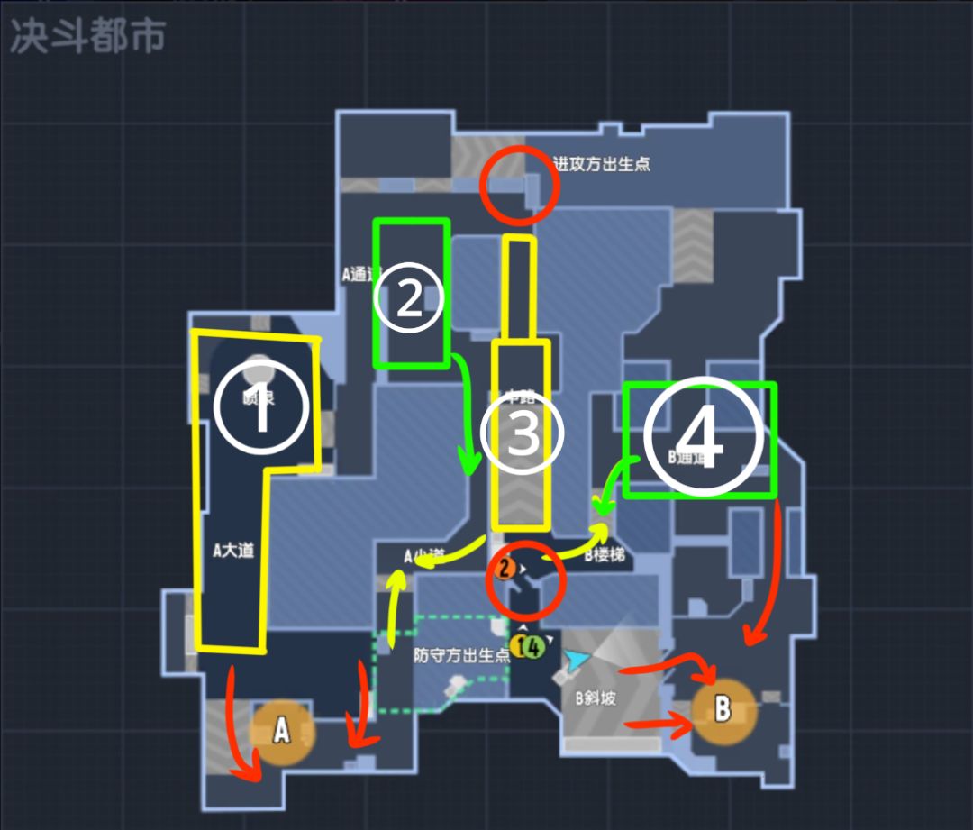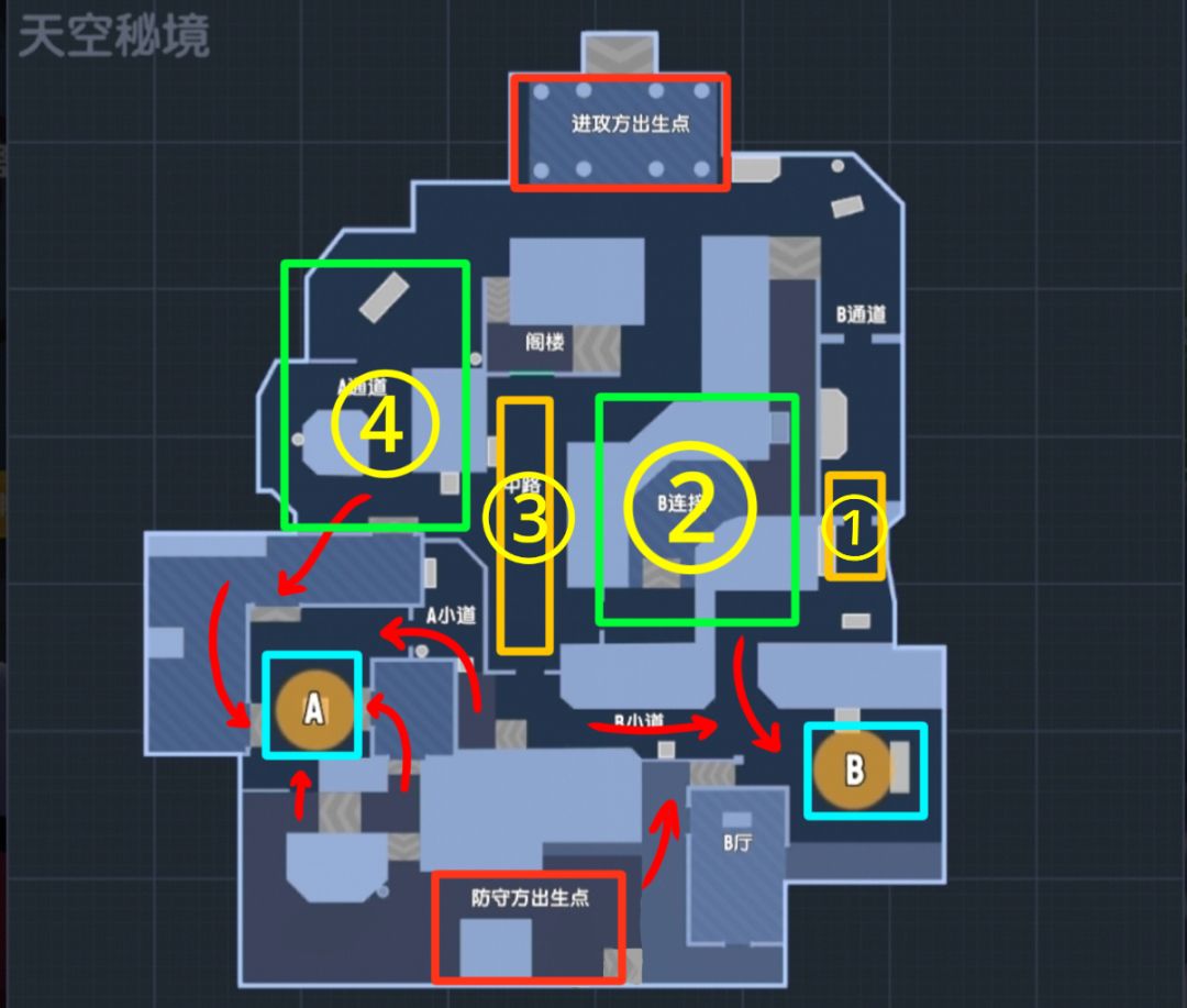 ④号路线:千万不要直接进攻B点,正如从1路线进攻A点一样,我们可以走侧边的通道,和2号路线一样可以进攻AB两点,相对而言也是比较推荐的!