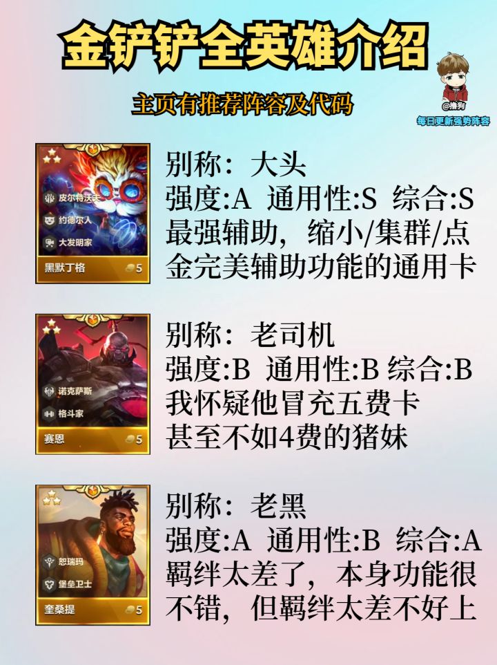 公众号爱下棋的撸狗有全部阵容攻略及代码,每日更新阵容榜单,下棋攻略
