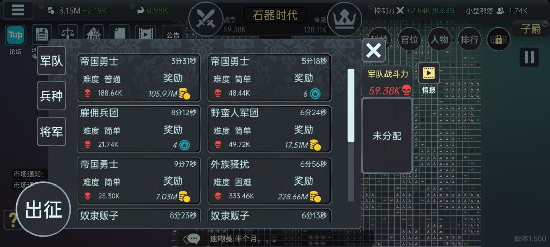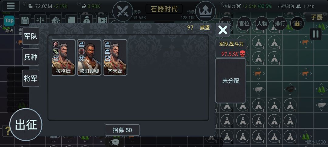 权威需要战斗胜利一定次数,战斗切记不要贪钱贪点数,一定要打比自己战力低的,因为你看不到对面的兵种,有时候对方战力比你低但有将军战术先手优势加兵种时代优势,你打不过就会清空军队,非常伤。军队数量上限关联威权建筑等级。完成任务后获得威望,威望可以用来雇佣将军或者官员(图6图7),提升战力和产能。