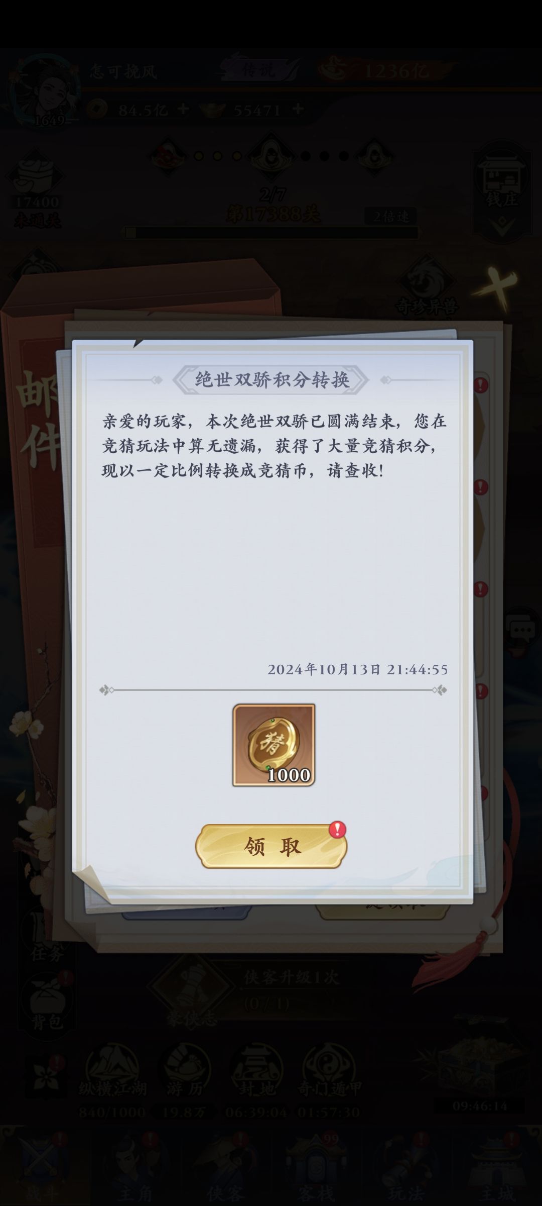 ,有时间可以上线蹲一下,应该是一小时猜一次,最多一次下100积分重点说一下,战力差的多的就直接下手压就好了