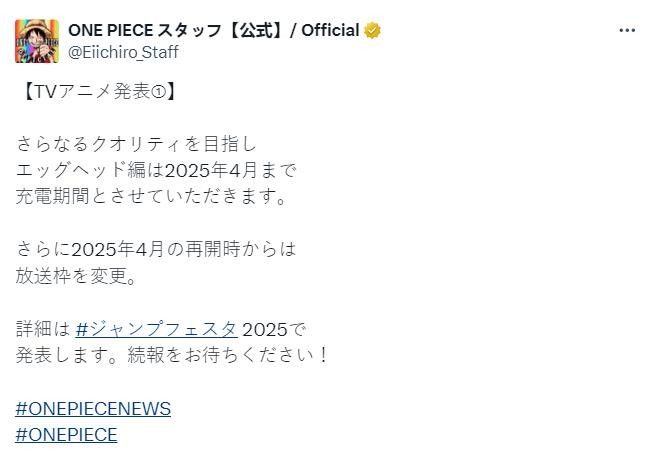 根据《海贼王》官方的消息,为了追求更高的质量,TV动画《海贼王》将进入充电期,目前的“蛋头岛篇”将在明年4月再次播出,并且届时《海贼王》的每周播出时间也将迎来调整,具体变化将在之后公布。