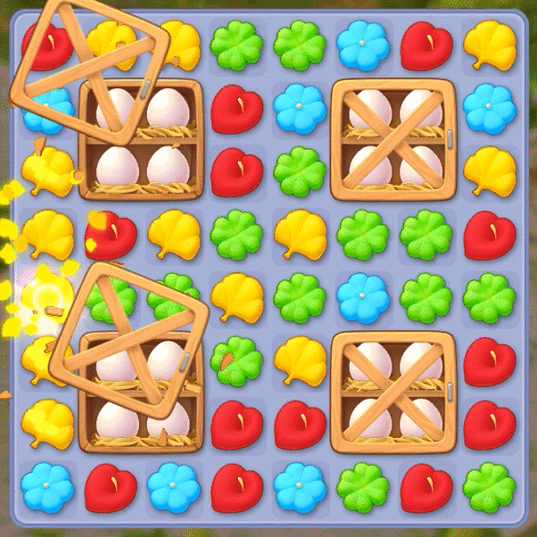 📕小Tips:鸡蛋盒被破坏后,鸡蛋会被随机释放在棋盘上,再次在鸡蛋边上消除,才会释放出小鸡仔哦~小鸡仔也需要额外消除一次才会消失~