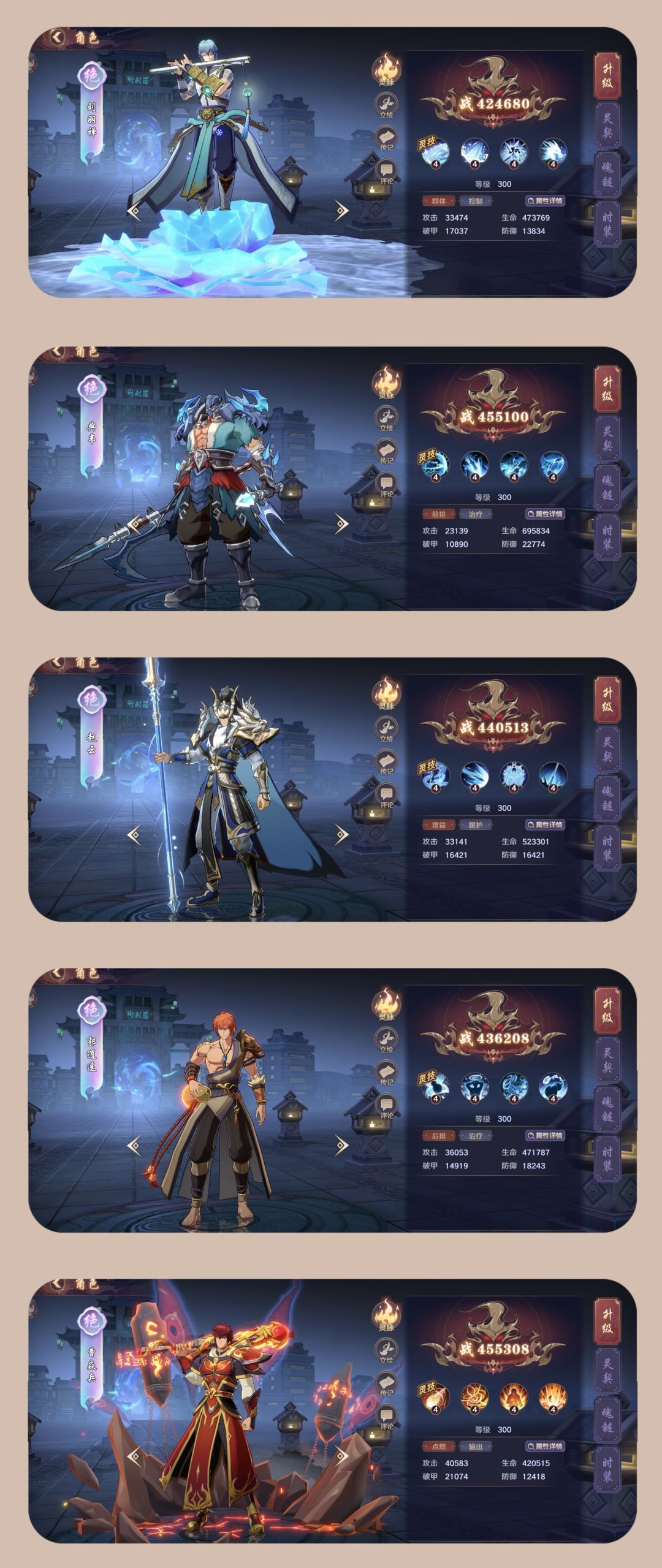 推荐使用曹焱兵、刘羽禅、赵云、典韦、郭逍遥作为开荒角色阵容,这些角色相对比较容易获取,适合平民玩家,强度还是非常可观的。