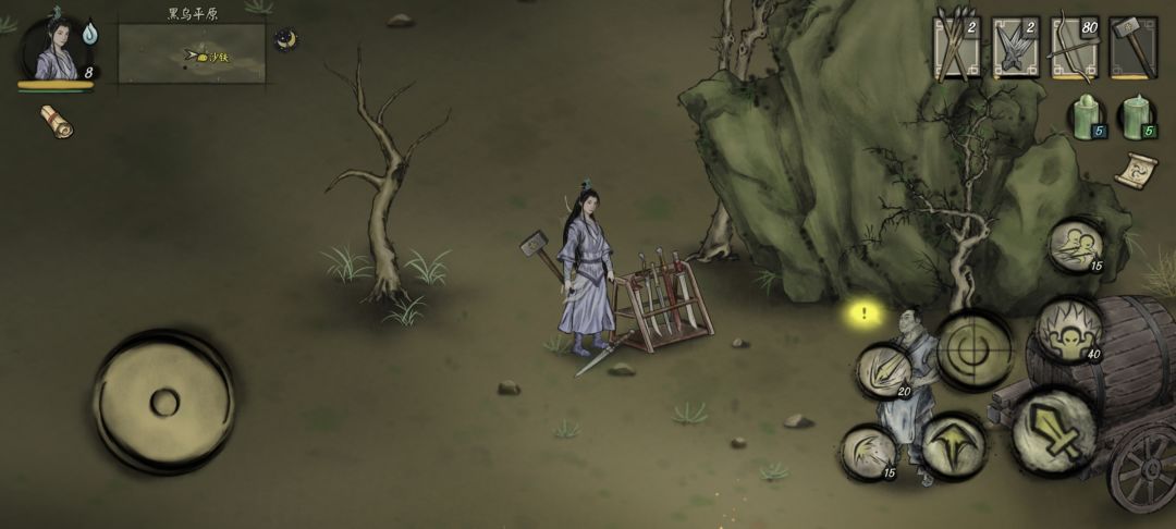 接着我们跑图至如图位置,会发现一个和避难谷一模一样的NPC-沙铁。细心的朋友会发现避难谷的沙铁一直在,所以这个是冒牌货!走近旁边武器架点击傍边的断柄,发现二者吻合,冒牌货出现黄色叹号,和他对话触发剧情。(*我们可以先不揭穿,先帮这个冒牌货做两个小任务,有额外奖励,如果接取直接揭穿任务会被放弃)。继续与其对话,触发战斗,老样子,残血逃跑。(不是,现在的boss都这么现实吗,打不过就跑)。回去报告芷雪,任务完成。(这个隐藏任务未完结,以后我们还会看见这个老6)。