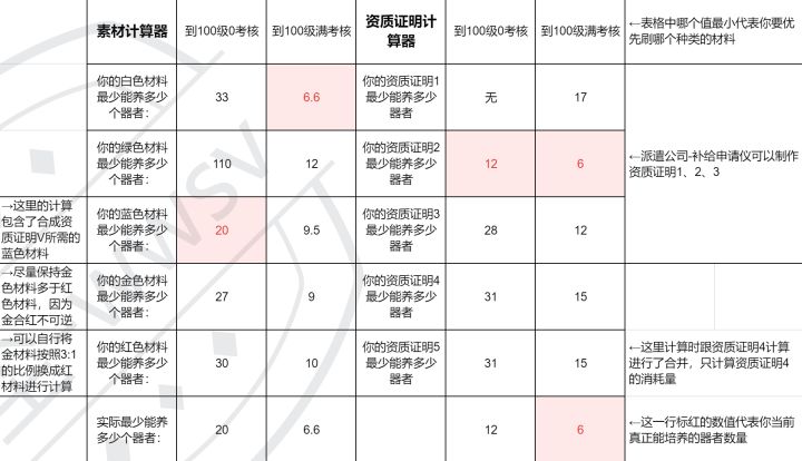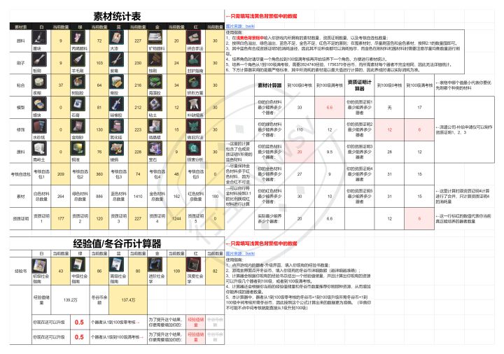 建议大家体力all in活动本,如果需要计算自己现阶段囤的材料足够多少个器者拉到100级满考核,可以用我这个计算器。