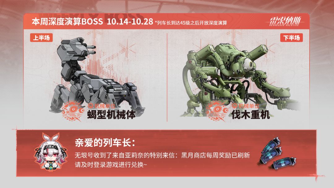 本周黑月商店货物及异构厄枝已刷新,请列车长及时登录游戏进行查看~