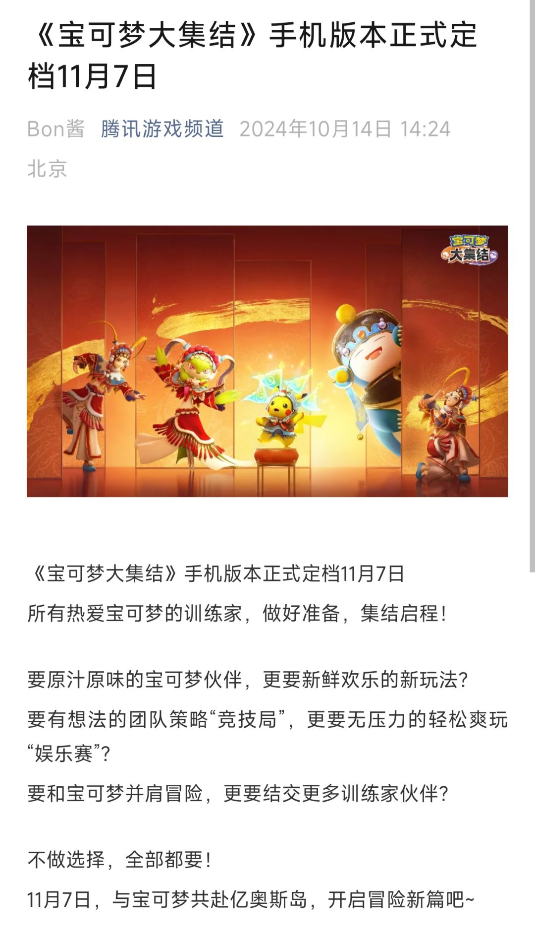 宝可梦大集结定档11.7啦 快快预约起来