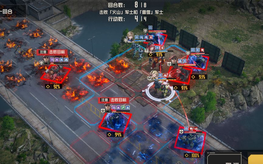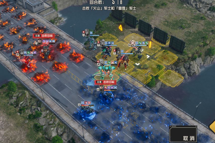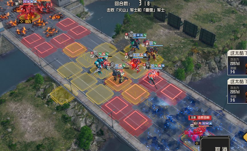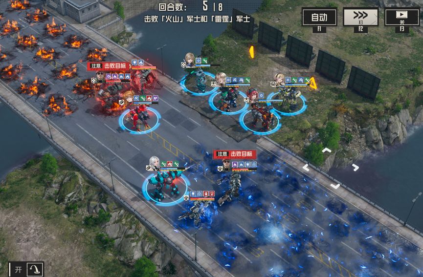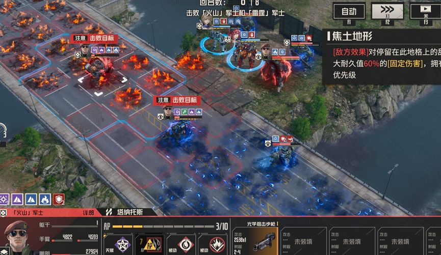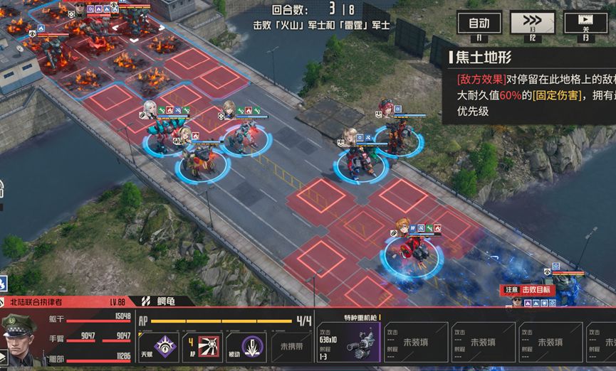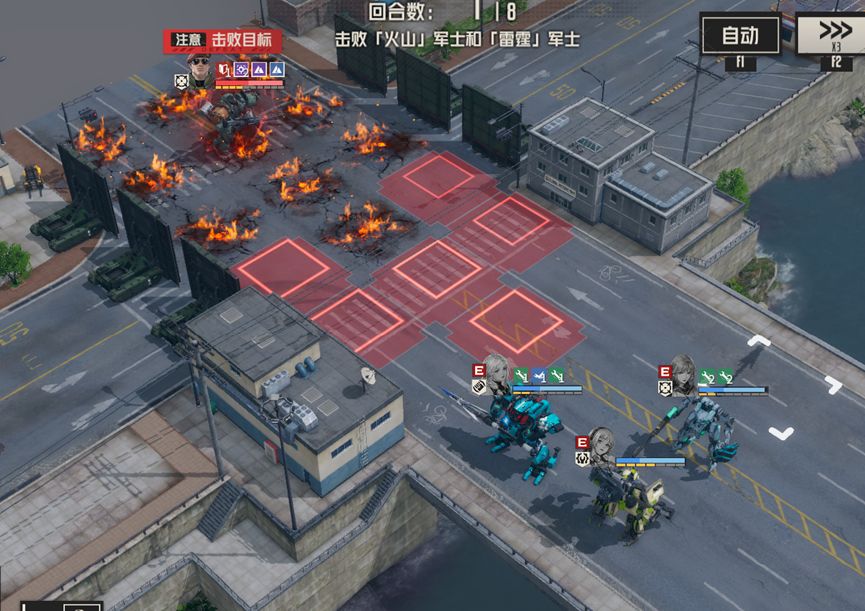 1、每回合boss对周围施加高额固伤地形,并且地形范围呈箭头状,意图是让我方往中路聚集