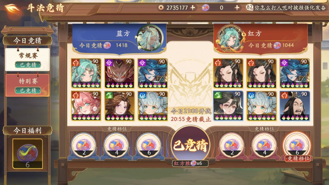 红方:九头鸟(速度218.7、法宝:九鸧绕月)、九头鸟(速度218.7、法宝:九鸧绕月)、孔雀大明王(速度175、法宝:五色神光)、无字经书(速度172、法宝:释言)、捧珠龙女(速度218.7、法宝:扶鸾)、羊力大仙(速度218.7、法宝:冷龙)