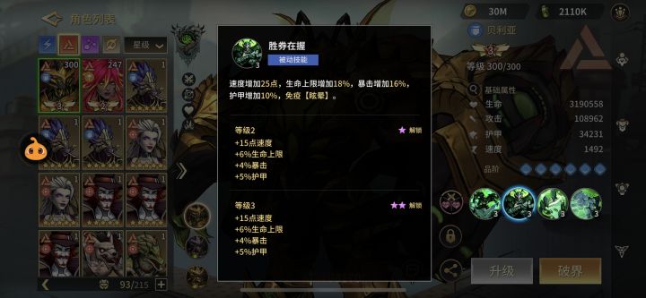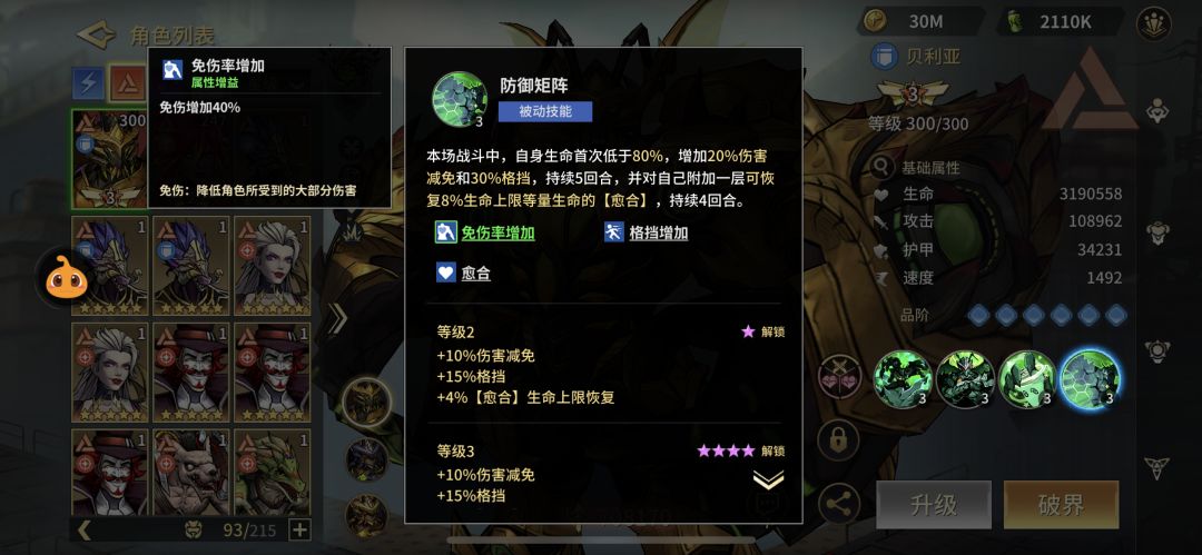 友方释放技能回复自身血量并50%概率眩晕一名对手。敌方释放技能对随机两名造成伤害并增加自身攻击。血量低于80%增加免伤和格挡,并回复一定血量,自身免疫眩晕。此被动也大大增加贝利亚战场的生存能力。