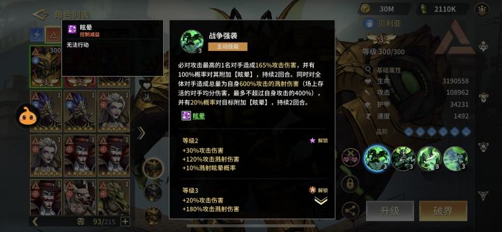 大招必对攻击最高的造成伤害,划重点是必中无视格挡哦。并100%眩晕对手两回合,同时对其它目标造成溅射伤害同时附加40%溅射眩晕概率。贱射伤害是跟主动伤害挂钩的,溅射无视格挡,无视其他目标护甲免伤。主动伤害打出暴击后,溅射伤害数值就会随之增高。大招起手有可能晕住三四个哦。