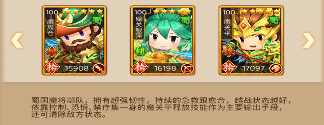 评价:蜀国魔一武将总体质量不错,三个魔将有整体性有配合,能附加各种增益,清除对方增益,有恐慌混乱,比较全面。三个三星蜀魔一就能拿下绝大部分五星神将队伍。关银屏是926的速度,要是能够五星,可以补充到关索队伍中去提升阵容。魔关平的清益禁疗和混乱都是两点,不过初始速度有点慢,单出优势不大。除了魔关银屏外,其余两个魔将不建议单出。