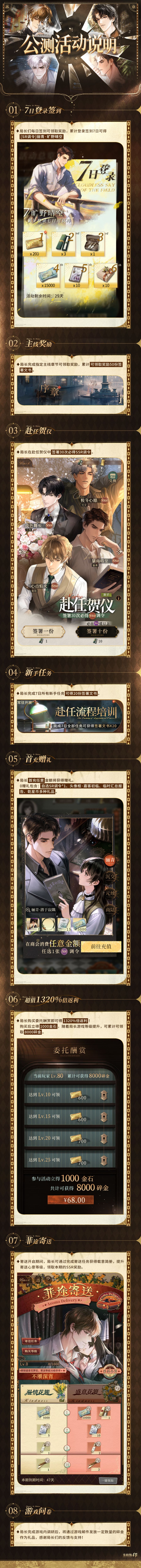 7日登录签到、主线奖励、赴任贺仪、新手任务、首充赠礼、1320%倍返利、菲途寄送等,欢迎局长来体验!