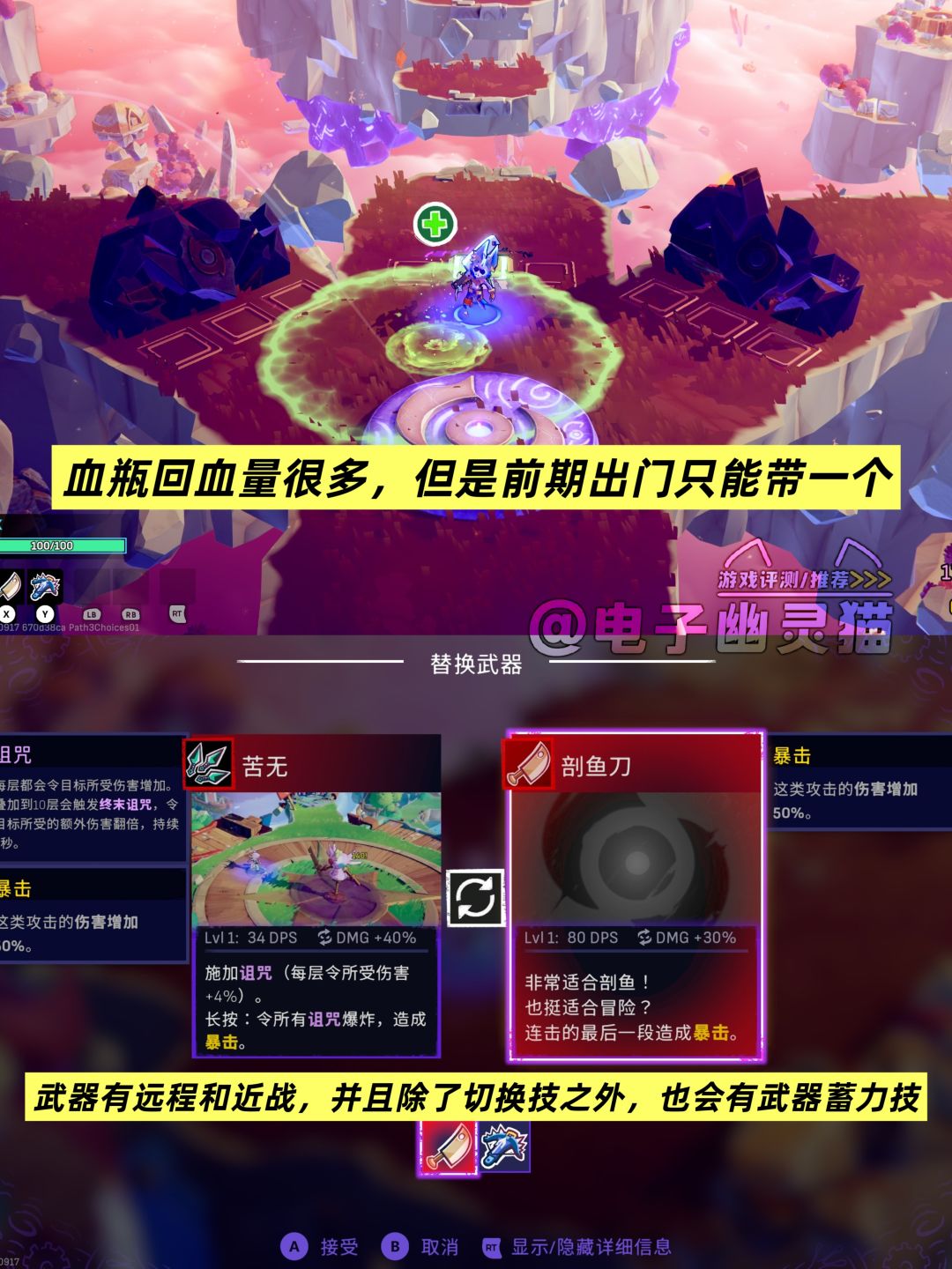 💬操作和玩法方面,除了随机性比较强的武器、饰品技能、被动加成等等,它是一款主打闪避的游戏,闪避可以用来在不同地块移动,包括一些有高低差的地块,当然,它作为“闪避”这个主要的作用还是很重要的,完美闪避会有一个很明显的慢动作音效。如果你喜欢,你甚至可以一直闪……它基本上是没有CD的,所以我在地块上跑路的时候,一路狂闪,这可比正经跑起来速度快多了。