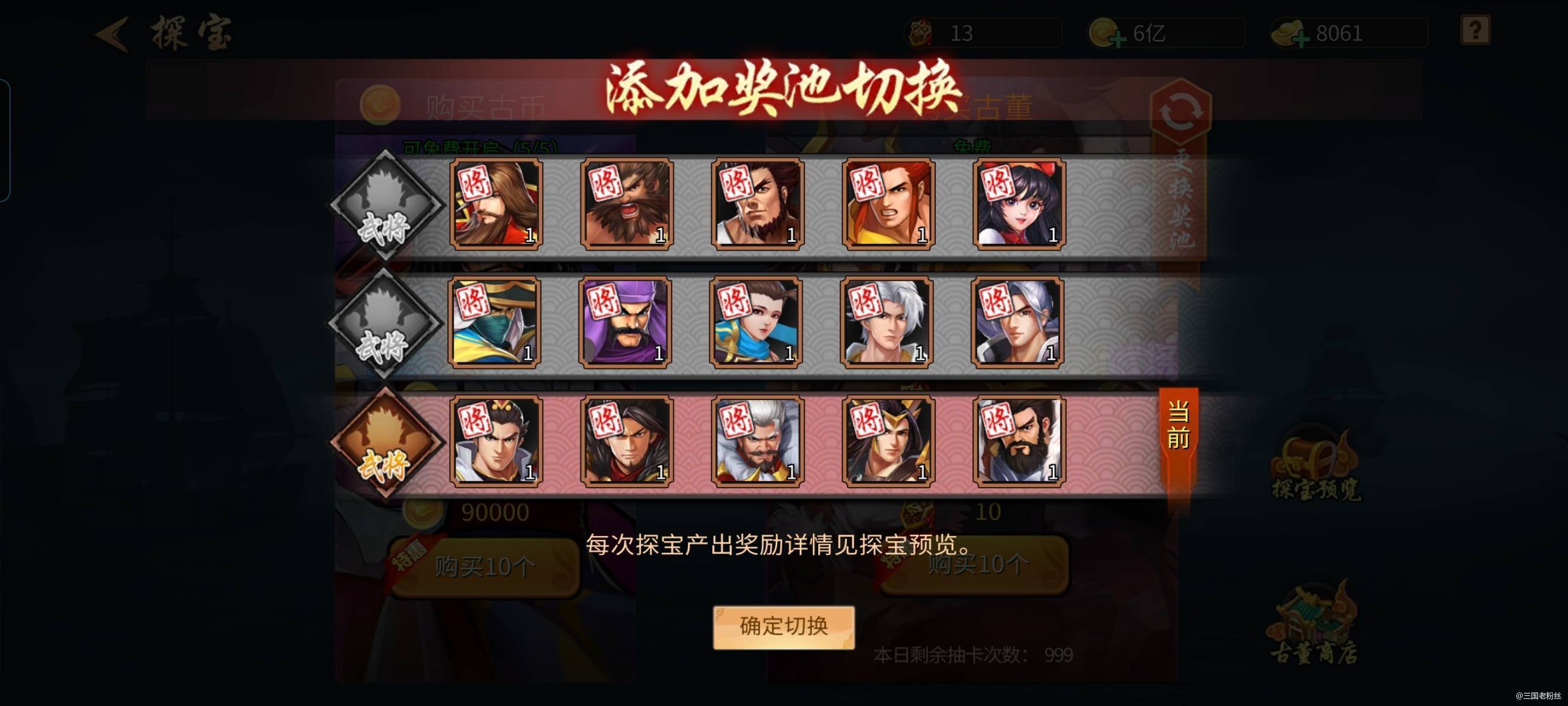 #攻略分享#探宝下次更新,金龙令有需要的可以提前存起来,增加了董卓,张秀,步练师,袁绍,文丑,程昱,虎卫张辽,虎卫夏侯惇,曹丕,孙尚香,诸葛瑾,荀攸,刘备,于禁。