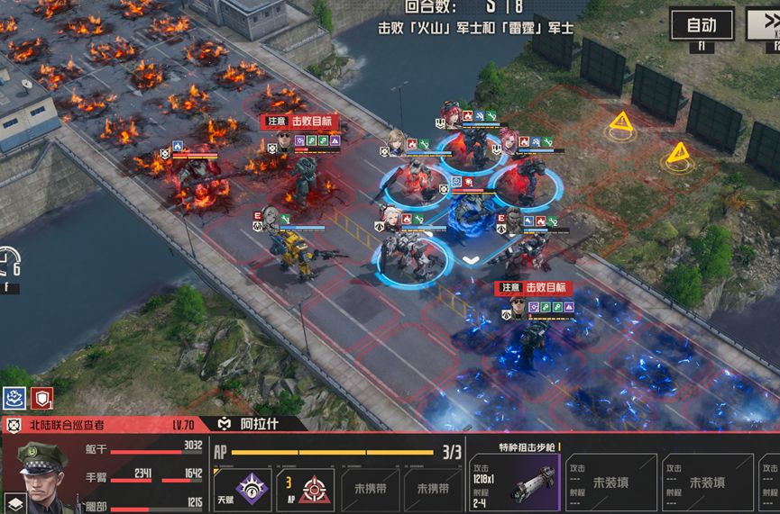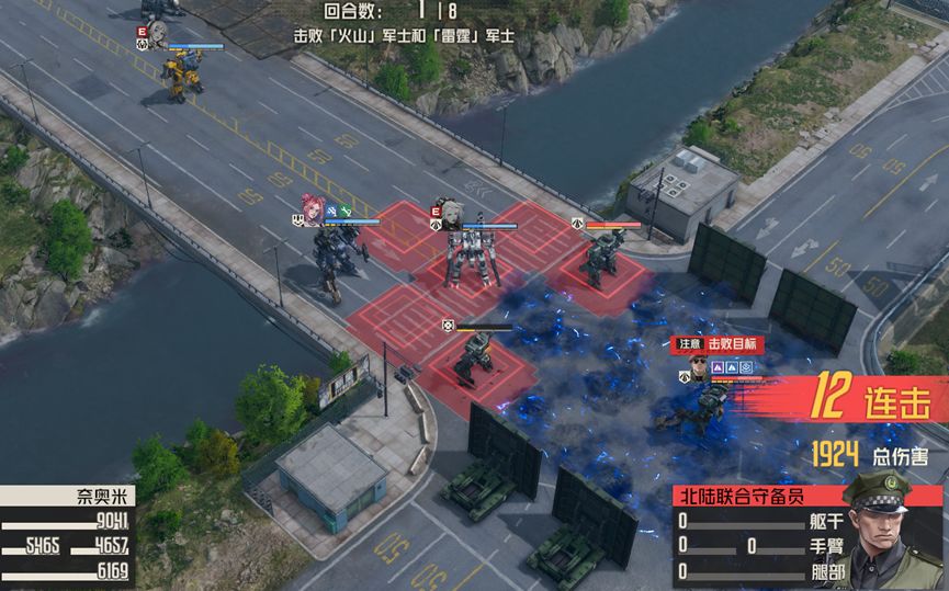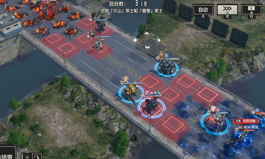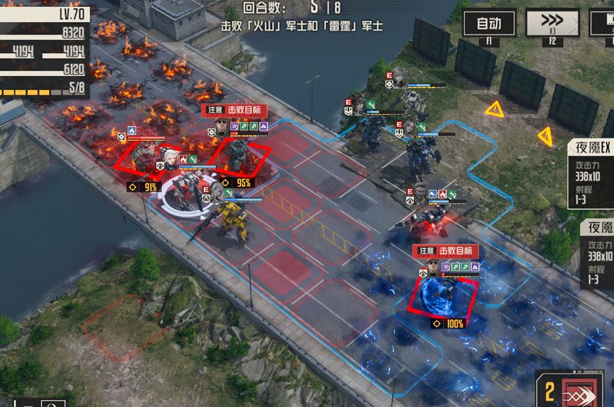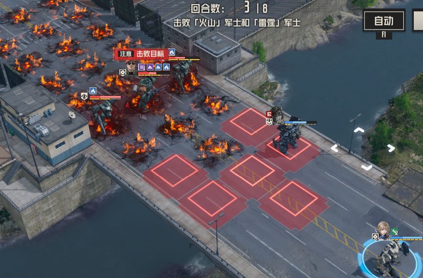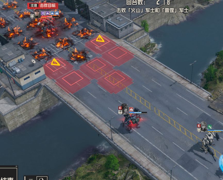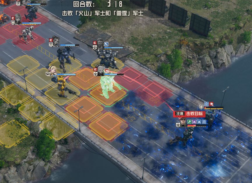 威廉架起消灭右边剩余小兵,奈奥米洛莎打右boss,洛莎每回合都需要移动,不踩到地形