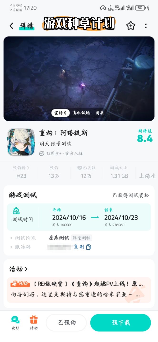 大家要注意嗷!报名测试后!要是有内测资格会发送一个激活码给大家!