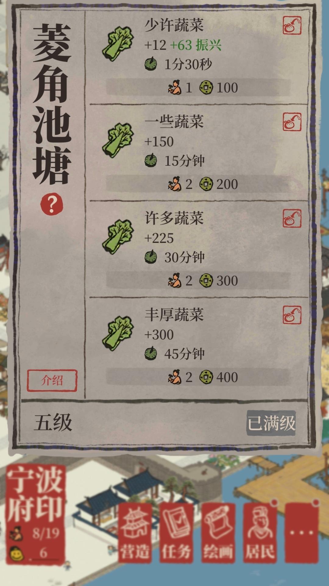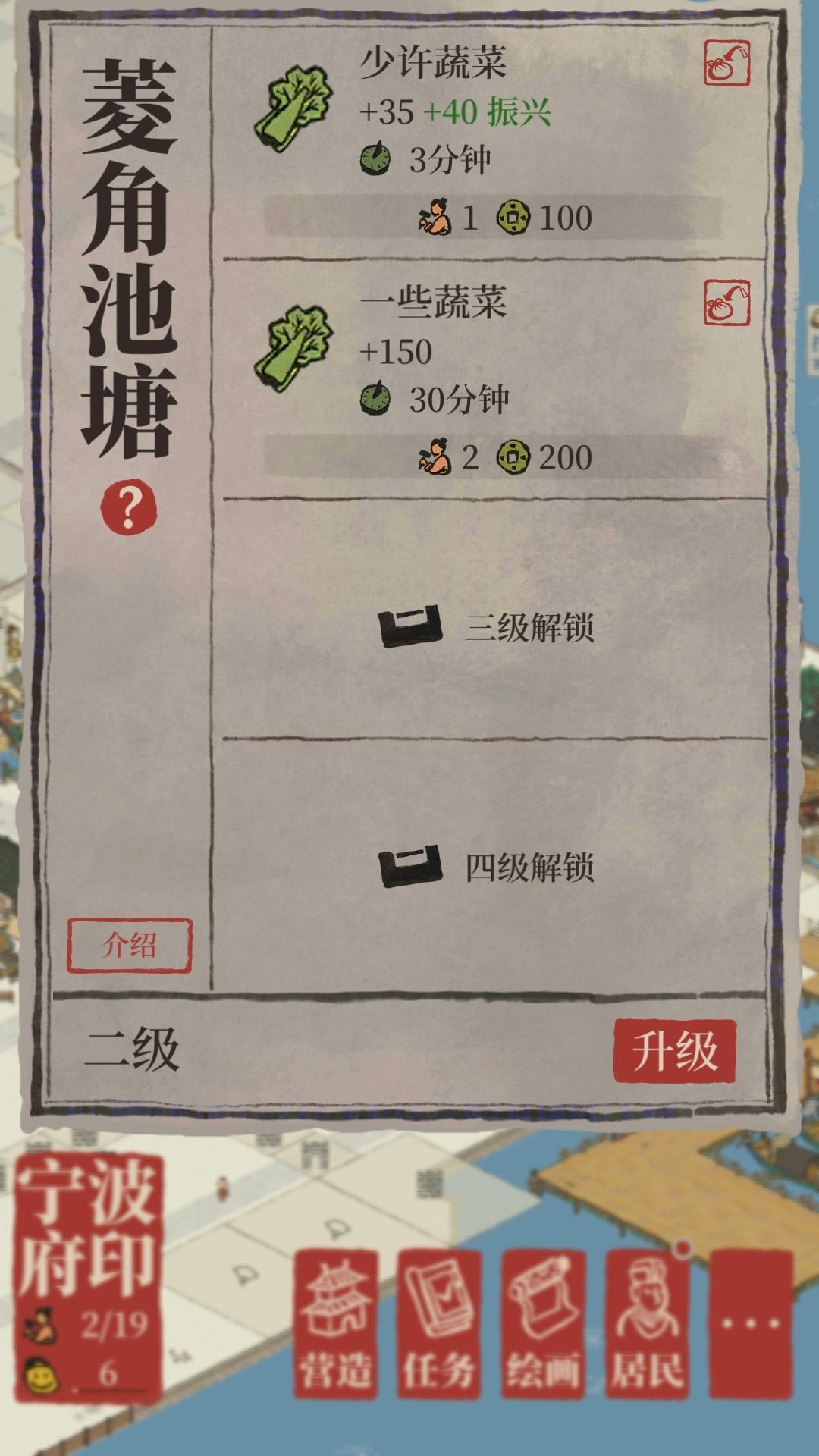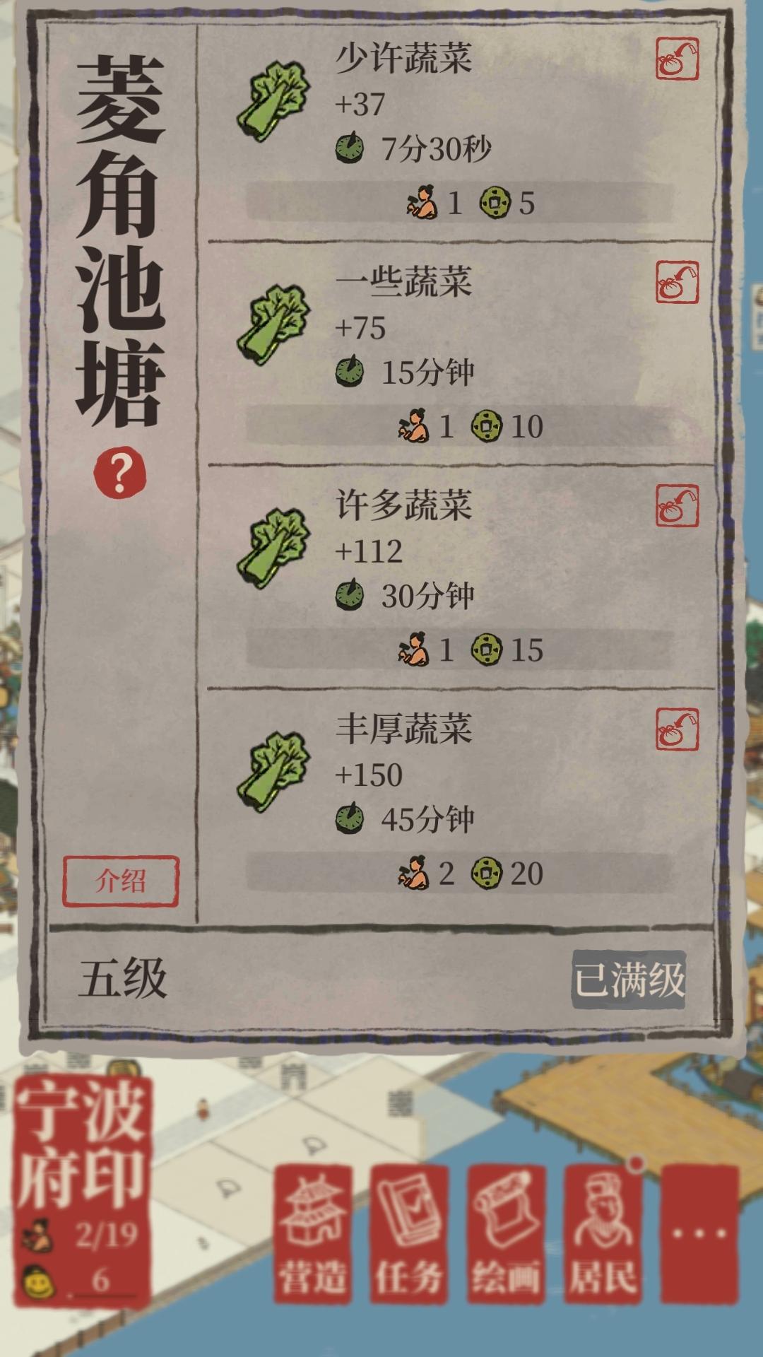 宁波府菱角池塘升级前图1升五级变成图2,当时好迷茫升五级咋消耗生产时间啥的变得那么奇怪