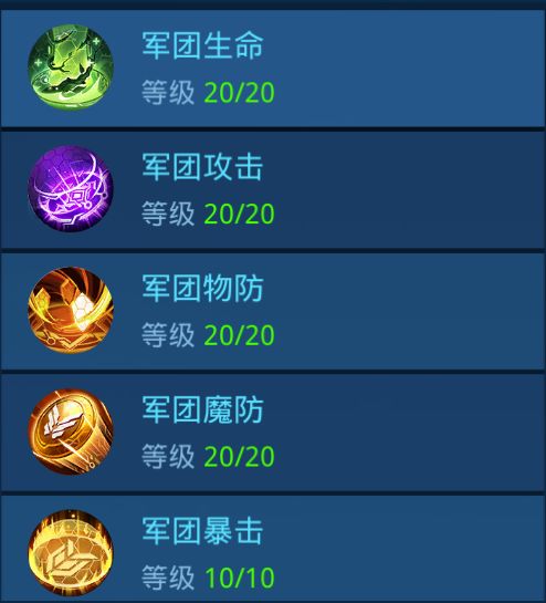 军团科技百分比增益:生命+20%,攻击+20%,物防+20%,魔防+20%