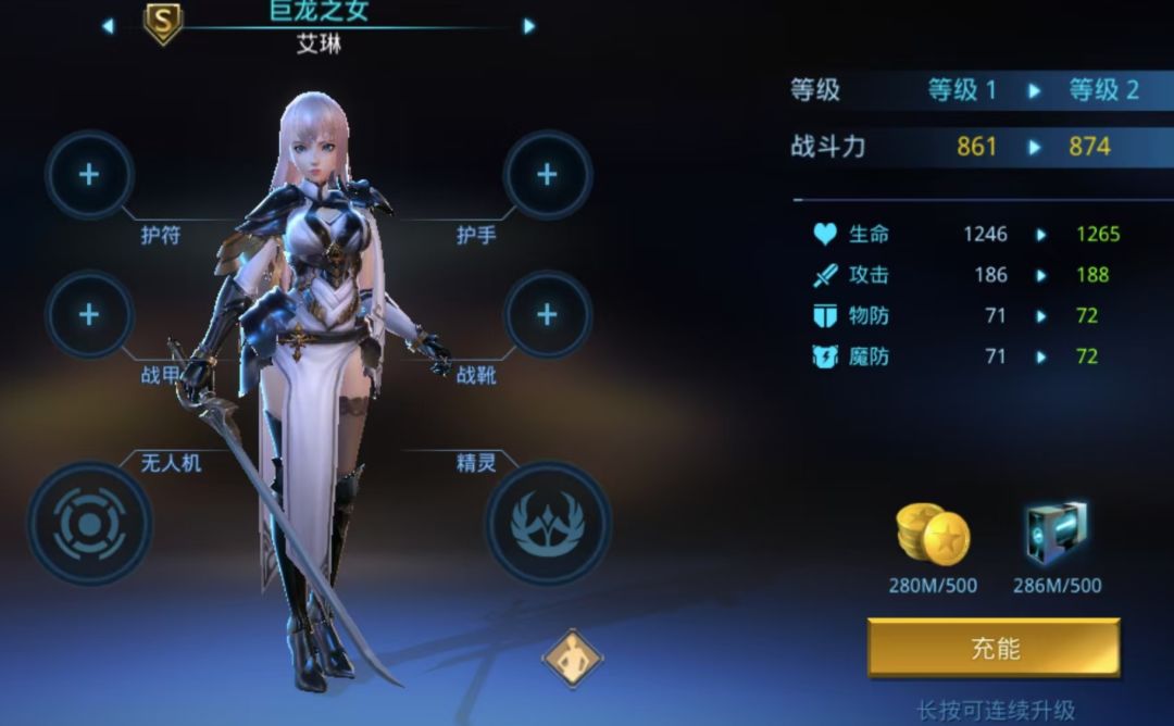 以巨龙之女为例,铜0阶、1级龙女初始属性如下: