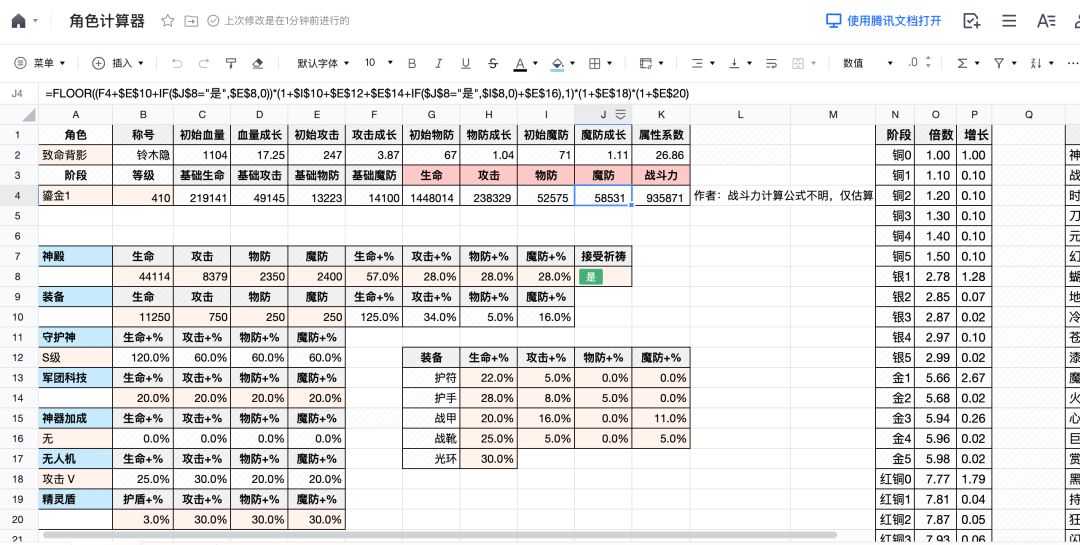 (INT([初始值+属性成长*(等级-1)] * 星级系数 * 品级系数) + 神殿固定属性 + 装备固定属性)