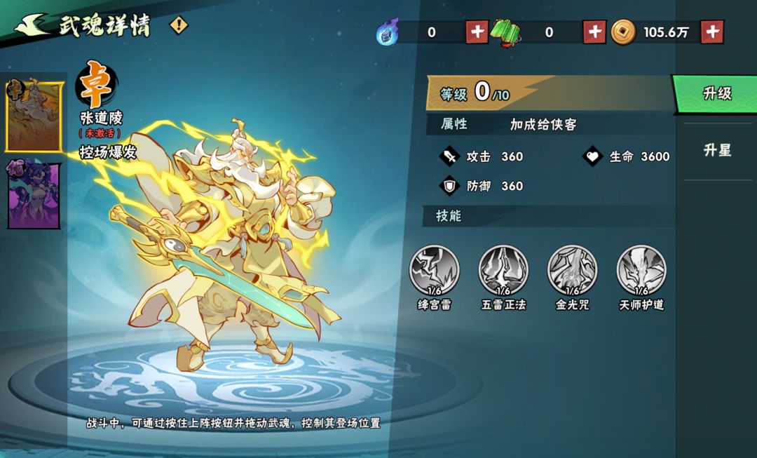 擅长控场爆发,引动天雷对敌人造成伤害,并附带晕眩效果。拥有「招式-绛宫雷」、「必杀技-五雷正法」、「助阵技-金光咒」、「登场技-天师护道」4个技能。