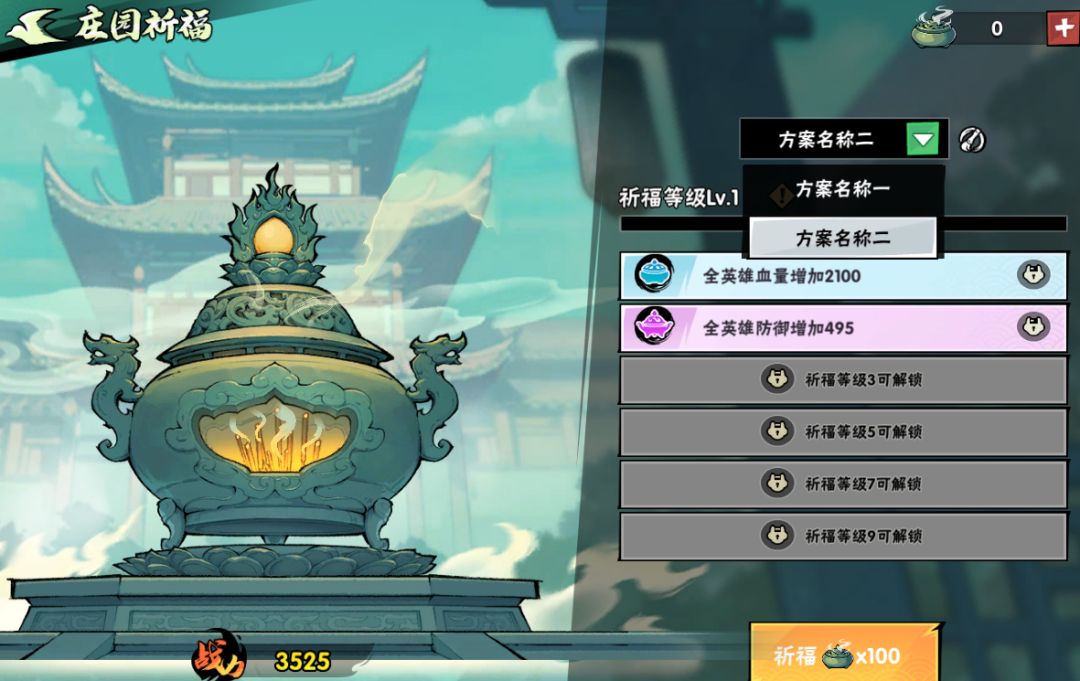 少侠在农场中交换农作物获得的【祈福香火】,可以用于在庄园中祈福,获得祈福护佑。祈福等级越高,加成越多,少侠还可以设置不同的属性加成方案搭配不同阵容