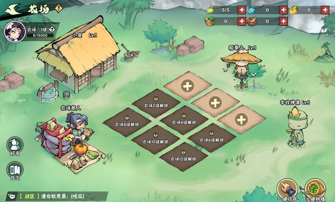 少侠可在农场中种植不同等级的各类作物,通过解锁农场等级获得更多田地,更有一键种植/收获功能,帮助少侠效率种田。