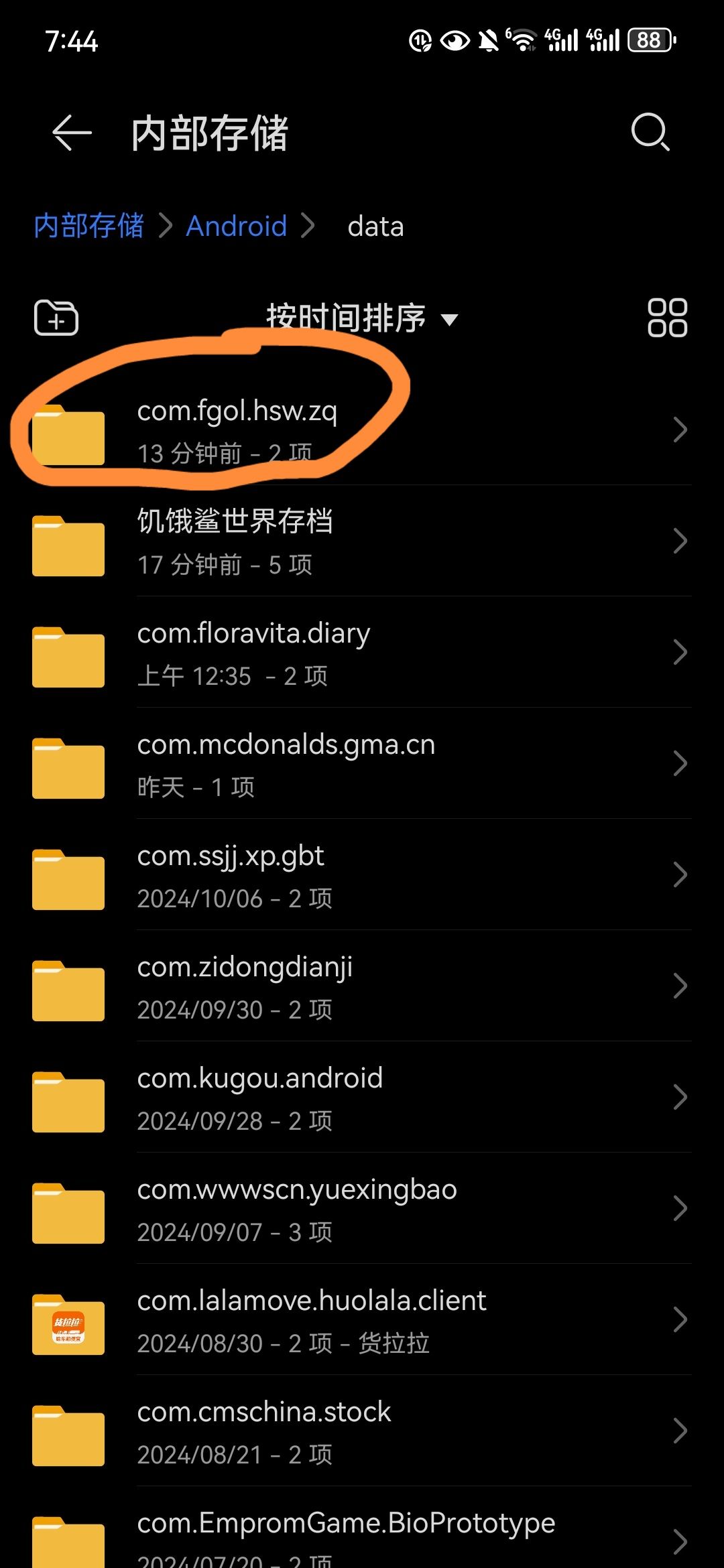 找到文件管理-Android-data-com.fgol.hws.zq(这是饥饿鲨世界的文件)-files-存档就是里面的三个带sav的文件,如最后一张图