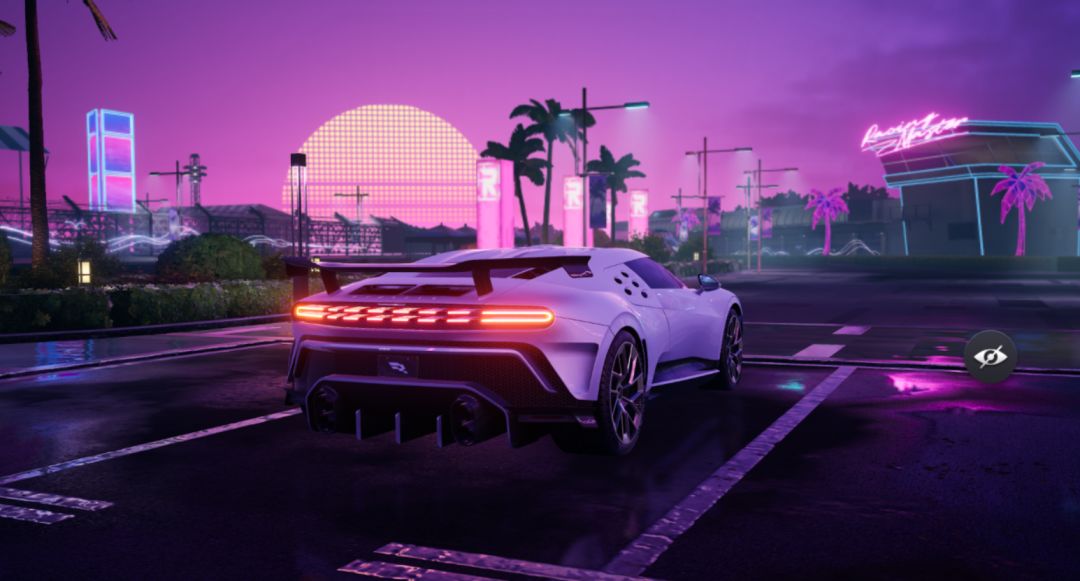 一进入主界面就看到“白龙王” 布加迪 Centodieci 停放在充满“未来感”的场景下:
