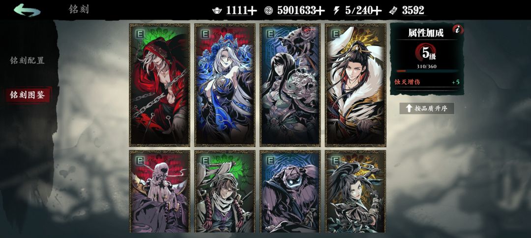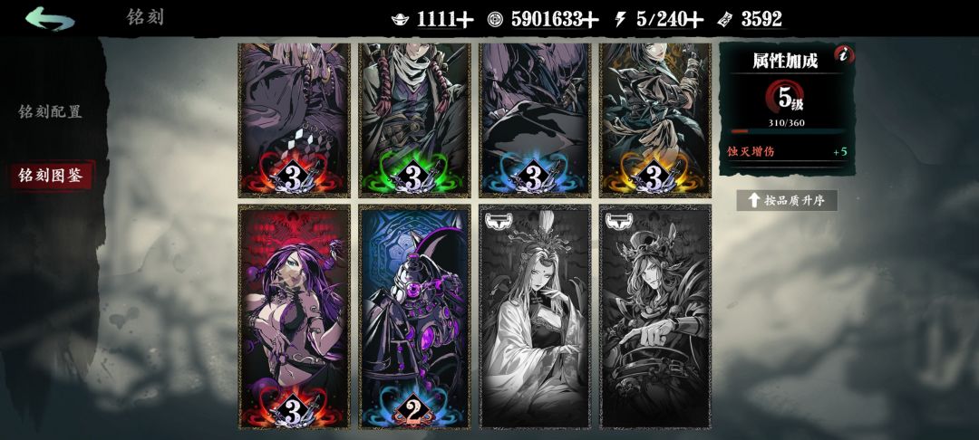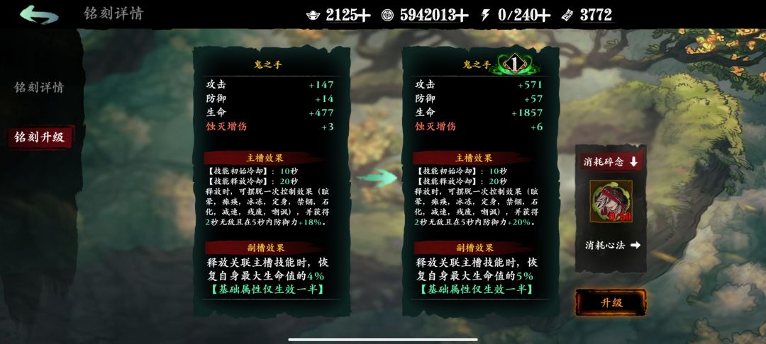 铭刻里面可以放8张卡片,咱们新号心法没有那么厉害,就按照我的放卡片就行,升级的话点击铭刻图鉴,点击你想升级的卡片,左边会有“铭刻升级”,点击进去升级界面,整个页面就可以看到,在图片右侧有两个选择“消耗碎念”,“消耗心法”。