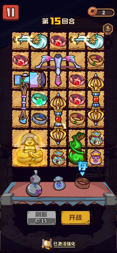 前两回合可以看出弩箭的强势 单体战力基本不输觉醒前的琵琶 这里注意 前两回合基本上会刷到额外格子 这里可以看到 我的摆法 没来锤子之前我就已经决定提前预留锤子的位子 前期摆格子一定要考虑自己武器占格 然后就是取舍 基本上不考虑拿杵子 优先弩 锤