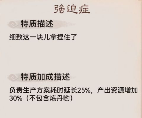 强迫症会延长四分之一的生产时间提升将近三分之一的单次生产产量,配合工作狂能打出combo效果(请各位道友自行选择)