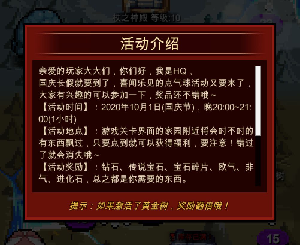 【活动地点】:游戏关卡界面的家园附近将会时不时的有东西飘过,只要点到就可以获得福利,要注意!错过了就会消失哦~