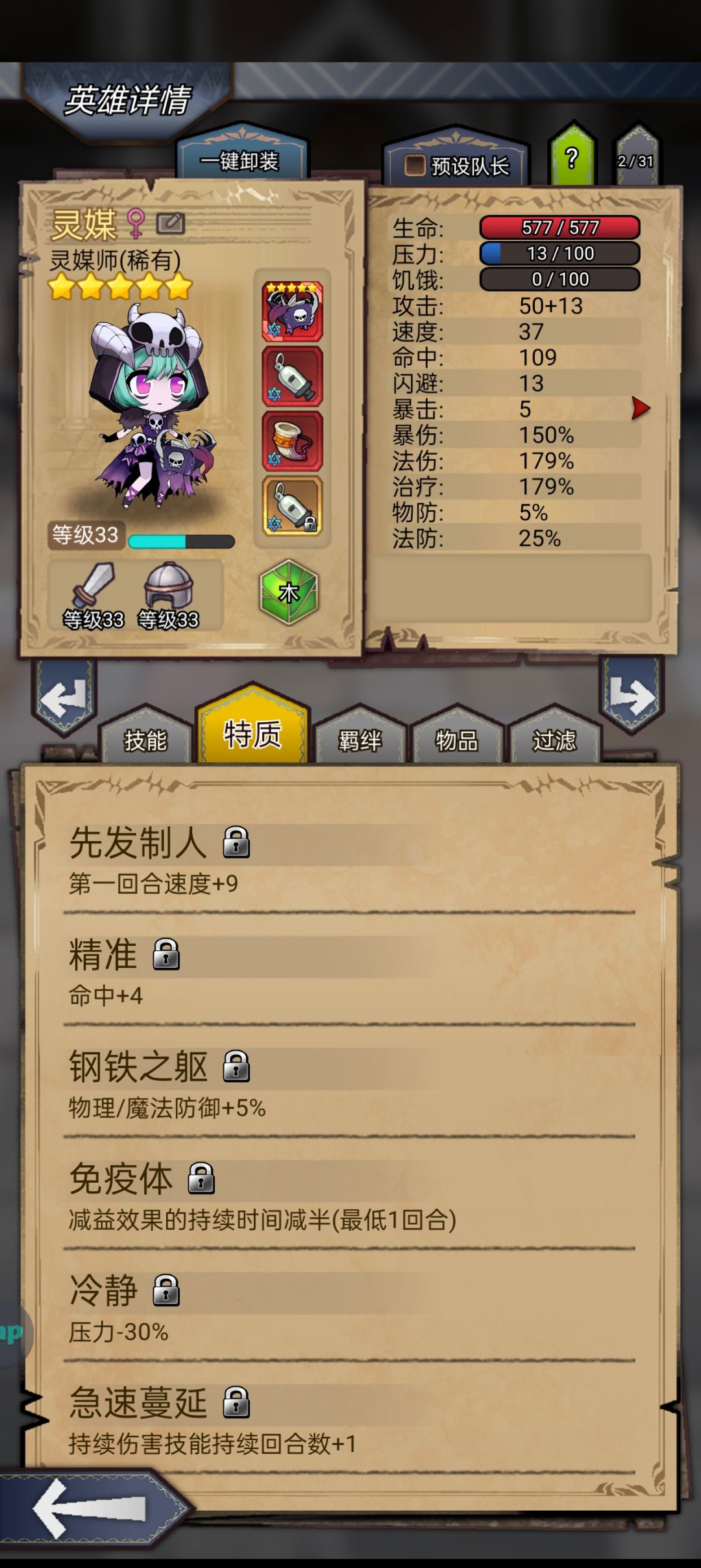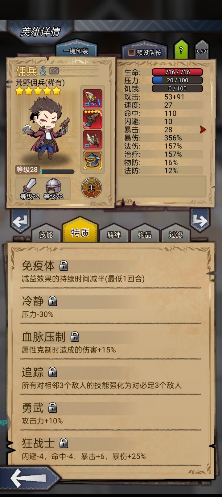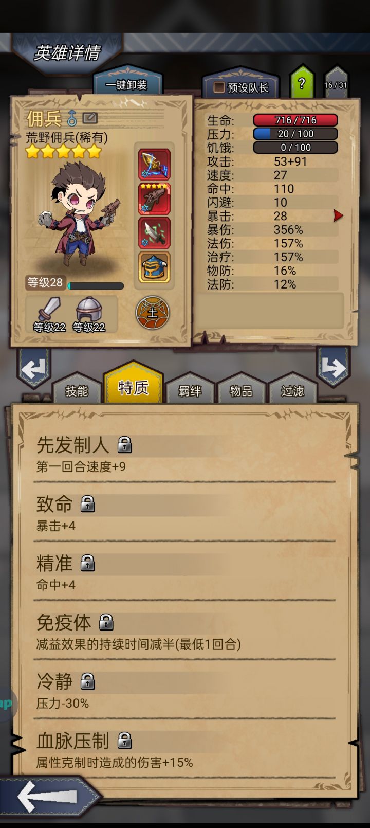 佣兵装备精华都没有打满,附魔更是一塌糊涂。特质,佣兵特质冷静和免疫体换上血统打击和骁勇善战效果会更好。镇长标准挂件技能。赌2死1残,或者赌1死1晕