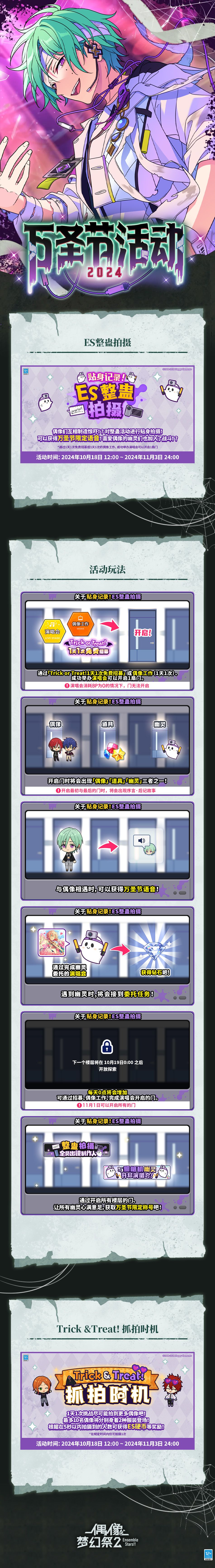 活动期间,每日通过演唱会、「Trick or Treat!1天1次免费招募」或偶像工作(每日限一次)可以开启一扇门,开启门时将会出现偶像、道具、幽灵三者之一。