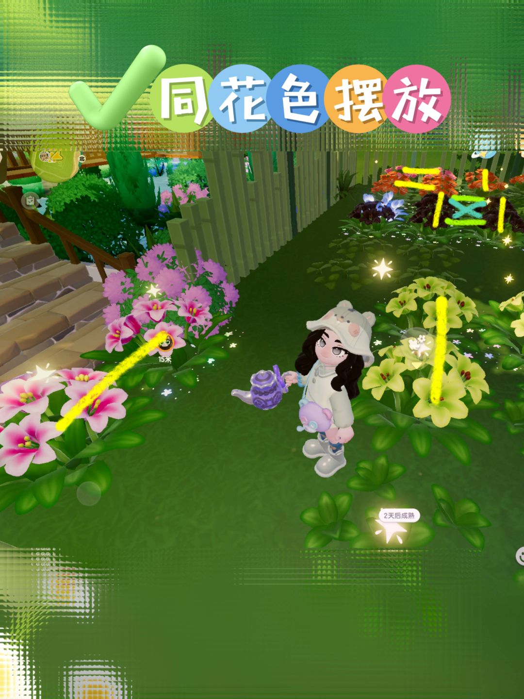 把1星花扎堆放一起,1x1,2x2,3x3,6x10,都可以~随意点~种多点自己的目标花就可以~