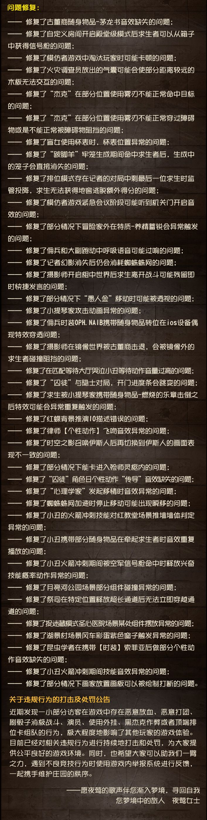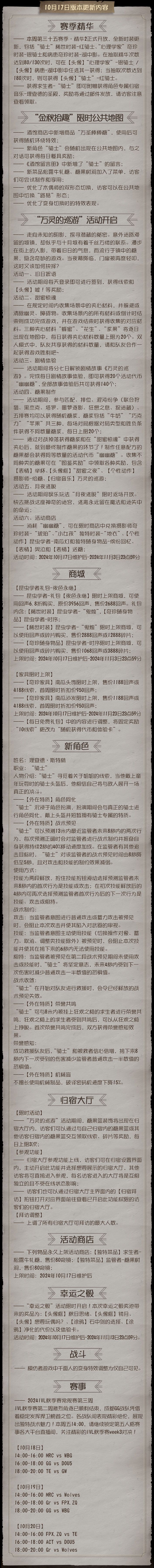 2024年10月17日维护公告: —— 本周第三十五赛季·精华2正式开放,全新时装更新,包括“骑士”稀世时装-红骑士、“心理学家”奇珍时装-银骑士和病患奇珍时装-湖中影; ——【新求生者】“骑士”上线; ——【“万灵的巡游”活动】开启,参与活动可获得摄影师奇珍时装-“琥珀”、“小女孩”独特时装-“地衣”、【个性动作】昆虫学者-南瓜灯和独特随身物品-缤纷回忆、【表情】哭泣和【表情】送糖等丰富奖励; ——昆虫学者-礼包【夜色永继】限时上架商城。 更多内容请点击长图了解~