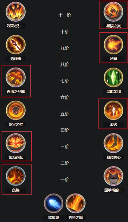 - 十一阶推荐优先点右边的星陨之炎,为3格大范围AOE,在有燃烧地形的情况下140%倍率的伤害可观,且由于目前的一些特性可以触发高地和背击(正常是不能的),还为专属逆塔中所需的技能,缺点是没有燃烧地形时只有一半伤害,耗能4回转也较困难,需要外部回能。另外需注意个性的点燃数目为每个敌人点燃数目的总和,即每回合最多只有所有敌人的总共4次点燃。左边的炽焰涅槃适合对单,在满足条件时能配合个性施加多次灼烧和点燃,可组Dot队伍。球多可以考虑双开。