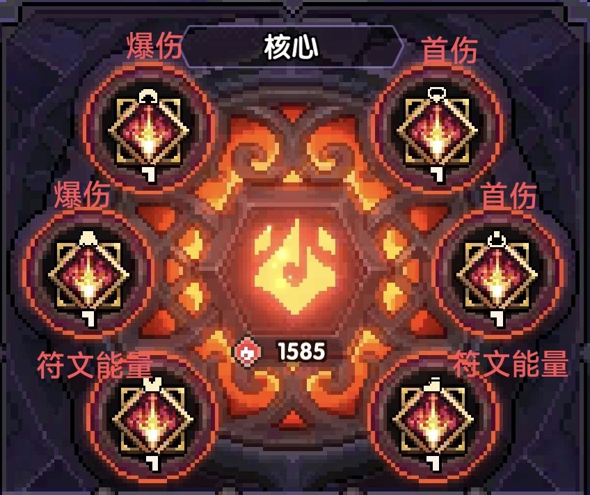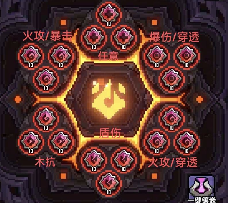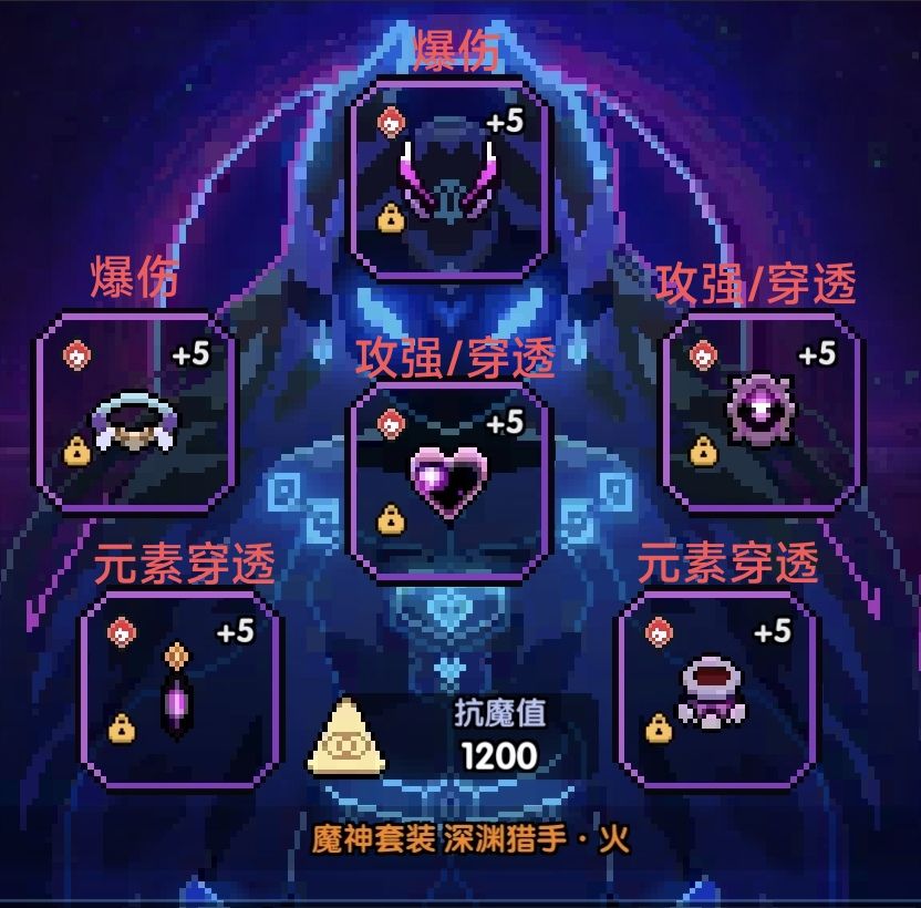 二阶外装副属性选择火攻+爆伤,一阶外装则魔角、核心、手镯、耳环选择元素穿透,腰带、徽章选择攻强/爆伤。