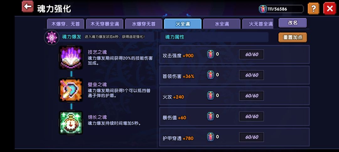 优先点名首伤、爆伤、火攻、穿透,暴击看你武器洗的是双暴击但是单暴击看着点,攻强和无限攻强分开点即可。