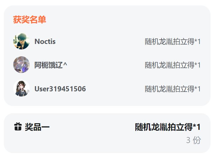 恭喜以下导演在本次活动中获得【随机龙胤拍立得*1】,请在11月25日前于后台填写准确详实的【个人收货信息】,如逾期则获奖资格作废。