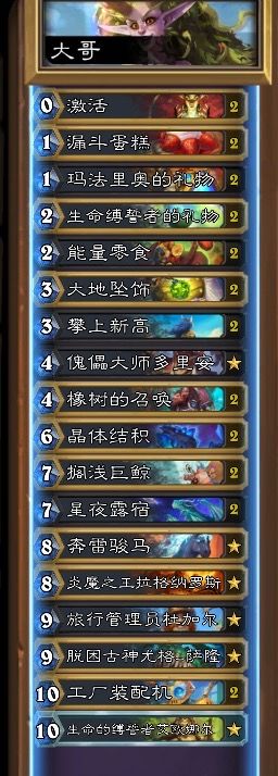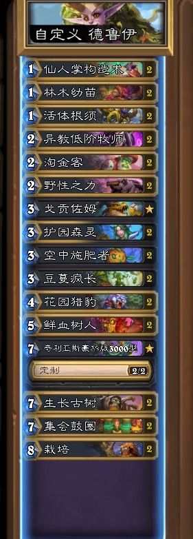 经典的德鲁伊快攻卡组,便于新手练习铺场、随从交换和计算斩杀。因为咆哮的退环境和王子的回归,树人卡组已经明显落后于时代,但是只要对面一波没有解干净,依然有机会栽培带走。