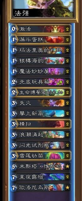 OTK卡组。操作难度较高,快攻抗性差。前期过牌跳费,关键牌到手八到九费即可完成斩杀。非常怕战士游客吃到法强,双地标在场可达八十血斩杀。