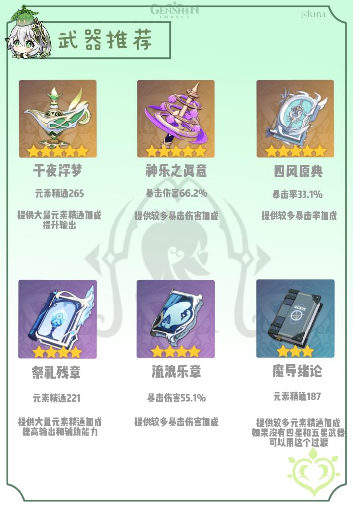 首先最适配的肯定就是纳西妲的专武啦——千夜浮 梦,不仅能为纳西妲提高元素精通加成,减轻圣遗物压力,也能为纳西妲提供输出。除此之外,也可以为队友提供少量的元素精通加成,提高了辅助能力。
