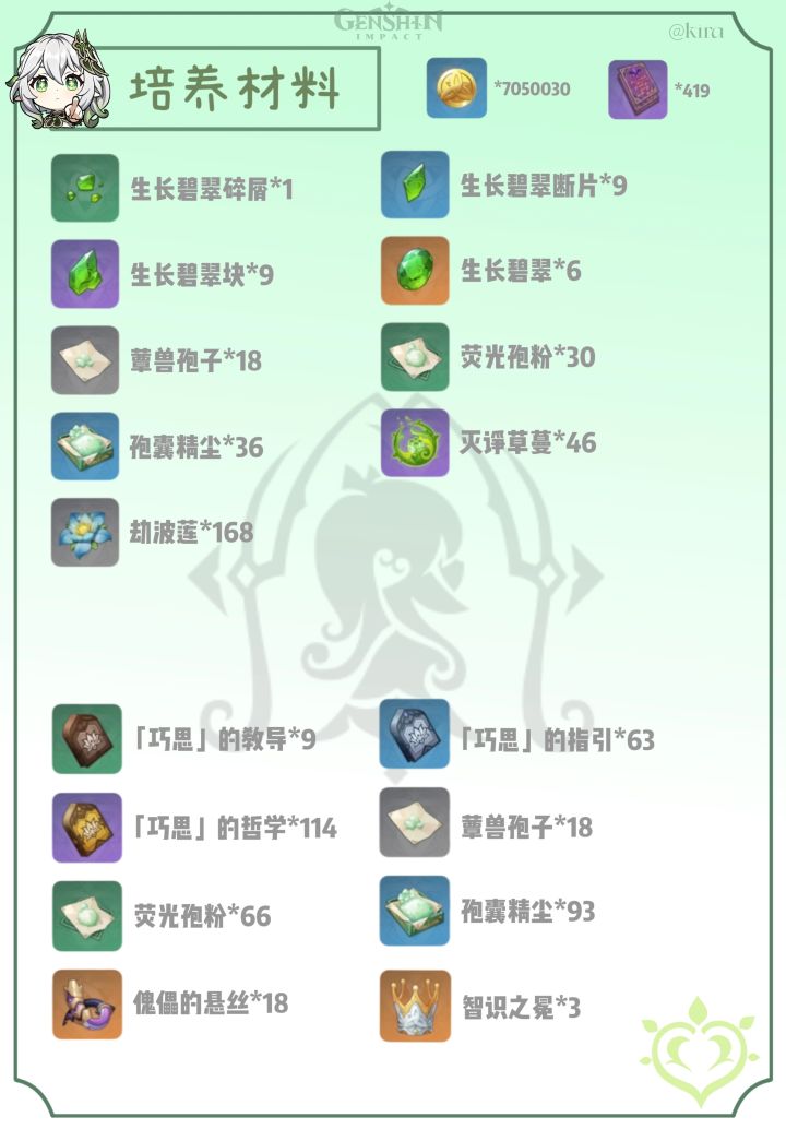 p2所展示的材料是从1级升到90级的材料以及天赋升满级的材料!需要打的怪物是蕈兽和无相之草。
