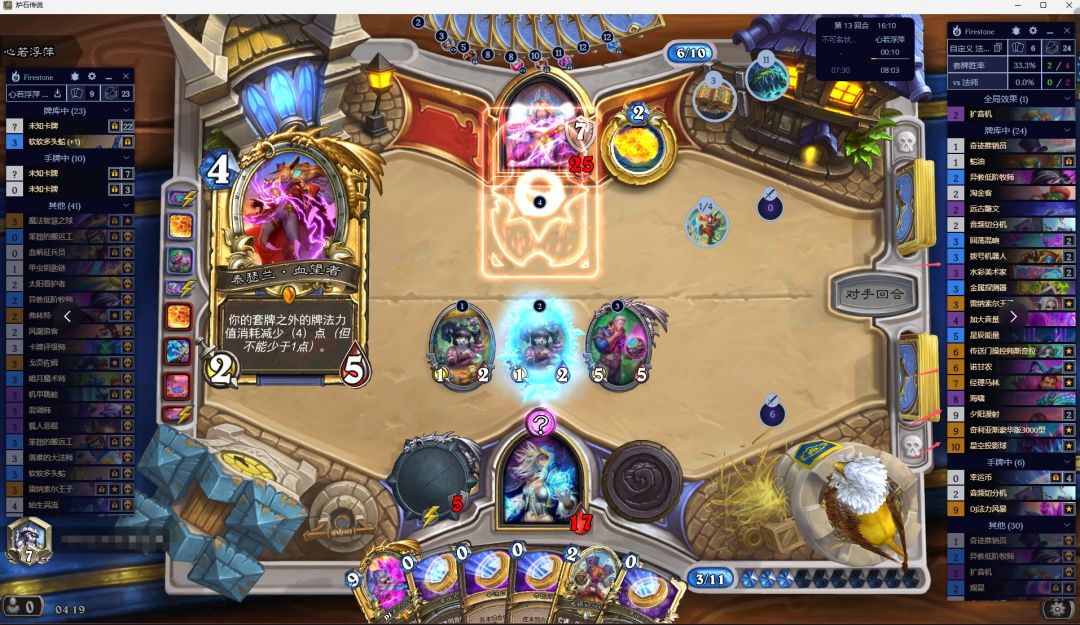图里可以看到,13回合了,我牌库6费以上基本全在,就只抽到一张海啸,捞牌的水彩拨号2个全在牌库,