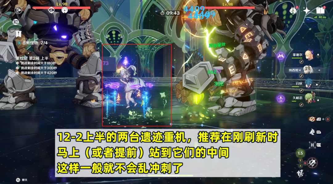 第二间上半有两波怪,第一波是两只丘丘暴徒,第二波是两台遗迹重机。推荐在遗迹重机刚刷新的时候,马上(或者提前)站到它们的中间,这样一般它们就不会乱跑了。如果站在一侧的话,其中一台遗迹重机很可能使用冲刺,导致位置散开。第三间上半是两只遗迹龙兽·地巡,这个不少小伙伴应该都很熟悉了且没有什么难点,就不过多赘述。